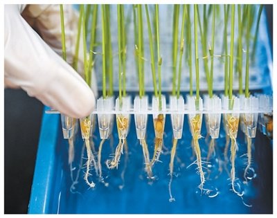 安徽合肥,科研人员观察水稻水培幼苗根系长势。张大岗摄(影像中国)
