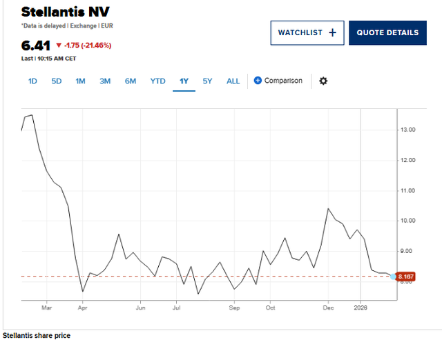 近年来,斯特兰蒂斯公司一直在艰难应对销量下滑和盈利不佳的问题,这也使得该公司股票承压多时,其股票在意大利市场上去年下跌近25%,前年下跌40.5%。自 2026年初以来,其股价已下跌超过13%。
