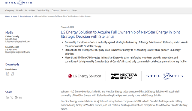 同样在周五这天,斯特兰蒂斯还在其官网宣布,将退出与韩国电池制造商LG新能源(LG Energy Solution Ltd.)在加拿大的合资企业NextStar Energy。LG新能源将收购Stellantis此前持有的合资企业49%的股权。