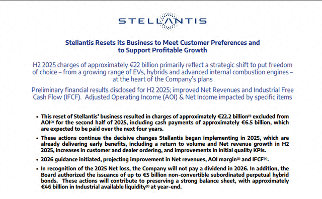 斯特兰蒂斯公司还提前公布了去年第四季度的部分数据,初步预计2025年下半年亏损190亿至210亿欧元。鉴于这一亏损情况,该公司已暂停2026年的股息发放,并计划通过发行混合债券筹集至多50亿欧元,以维持其资产负债表。