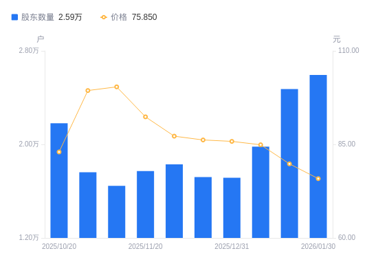 2月7日消息,数据显示,截至2026年1月20日,A股股东总户数为2.47万户,较上期(2026年1月9日)增加4922户,增幅24.85%。公司最新A股总股本为2.61亿股,其中流通A股1.86亿股,户均持有流通A股数量为7522.76股,较上期减少666.09股,降幅8.13%;户均持流通A股市值60.03万元,较上期减少9.49万元,降幅13.65%。
