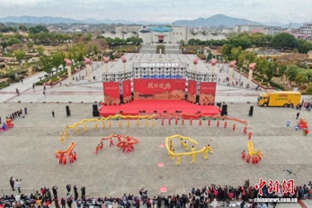 2月7日,一场盛大的民俗巡游活动在“客家摇篮”江西赣州的兴国县举行,约1800人组成的41支队伍,沿着兴国县城地标景点一路巡游,带来一场流动的非遗盛宴,热热闹闹迎新春。参与本次巡演的非物质文化遗产代表性项目包括定南瑞狮、信丰南狮、赣南采茶戏、崇义三节龙等,该巡游活动也是“非遗贺新春 寻味中国年——2026来赣州过客家年”活动的主要子活动之一。图为巡游队伍在出发地兴国县将军园进行表演。(无人机照片)中新社记者 刘力鑫 摄