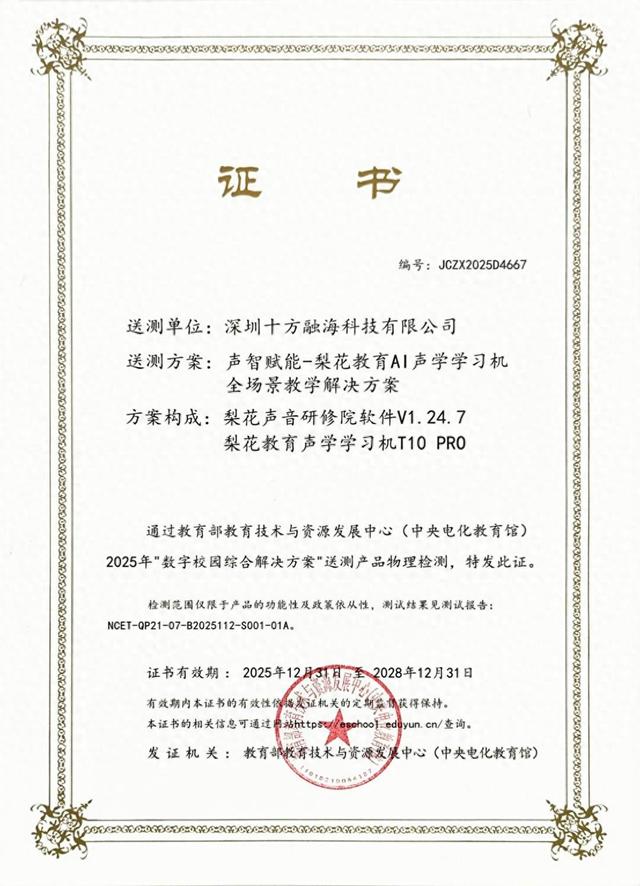近日,教育部教育技术与资源发展中心(中央电化教育馆)正式公布2025年“数字校园综合解决方案”测试合格名单。由十方融海梨花教育自主研发的“声智赋能——梨花教育AI声学学习机全场景教学解决方案”凭借创新性软硬件协同设计与卓越性能成功入选,成为服务于中老年群体文化素养提升的领先数字化教学方案之一。