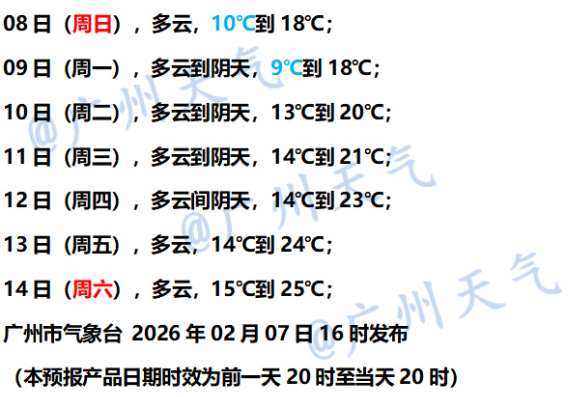 广州市气象台预计,2月8日—9日受冷空气持续补充影响,广州多云到阴天,气温逐渐下降至9~18℃,港区和高地阵风6~8级。2月10日—11日云量维持较多,气温有所回升。