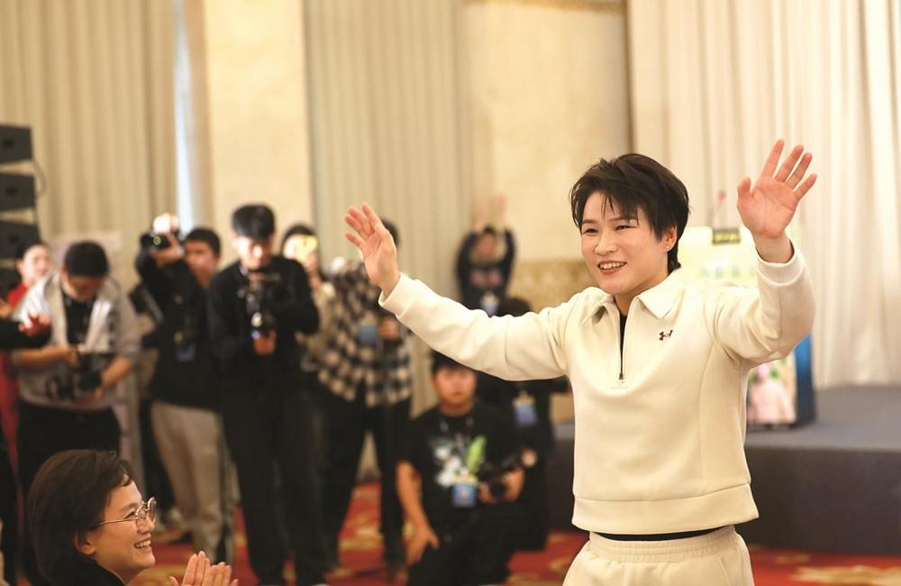 张伟丽向现场媒体记者致意。