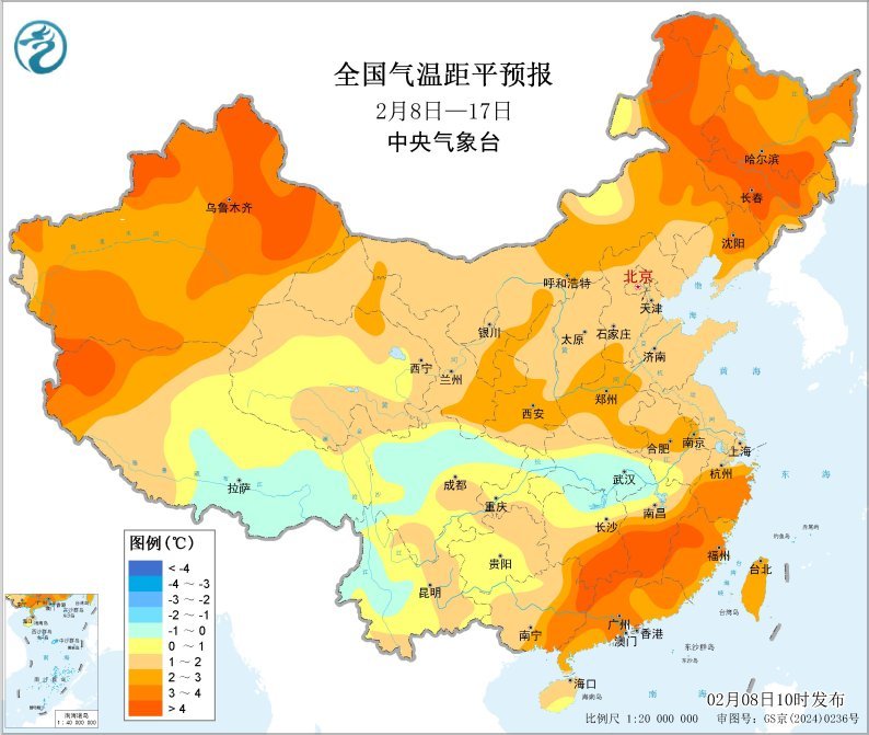 未来10天(2月8-17日),黄淮西南部、江淮、江汉、江南大部、华南西部、西南地区东部及西藏东南部等地累计降水量有5~20毫米,其中江淮南部、江南北部和西部、贵州东部以及广西西北部等地的部分地区有25~45毫米,局地超50毫米;新疆北部、黑龙江北部、吉林东部等地降水量有3~6毫米,新疆局地可达10毫米以上;上述大部地区降水量较常年同期偏多。