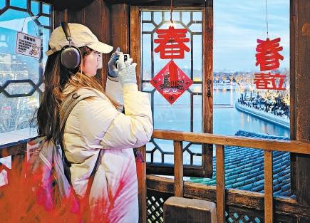什刹海边,游客用镜头锁定眼前的“春景”。刘淑敏 摄