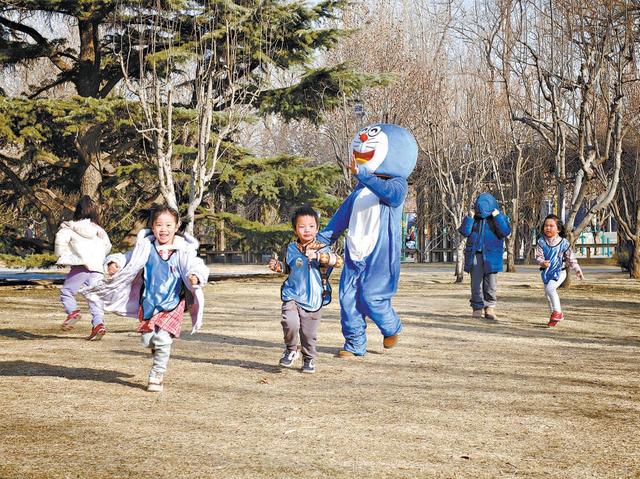 立春当日,世纪坛公园内卡通人偶与孩子们在草地上奔跑嬉戏。赵乃明 摄