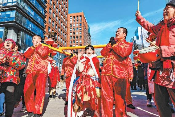 东四街道,8名专业杠夫抬着一根粗大的“栋梁”绕场巡游,一声声“春来了”的呼喊,响彻南新仓文化休闲街。董维臣 摄