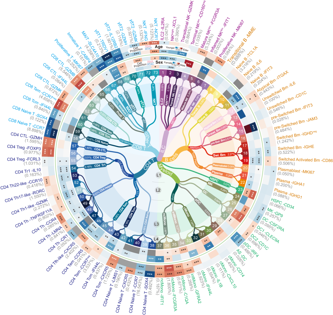 研究团队为每种细胞建立了详细的“身份证”,记录了它们的分布及基因表达特征,并且结合志愿者的生理数据,探索出年龄和性别等因素与特定免疫细胞特征的关联性。