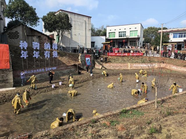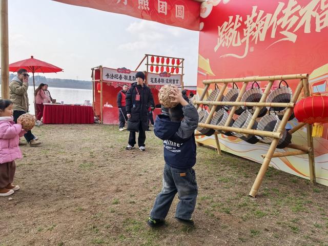 江边围炉煮茶区,游客在袅袅茶香中享受惬意时刻;童年游戏区,丢沙包、套圈、滚铁环等经典游戏轮番上演。但最热闹的,是干塘摸鱼区,洲上劈出一口不大不小的池塘,游客们可以亲水下塘,体验“年年有余”的传统寓意。
