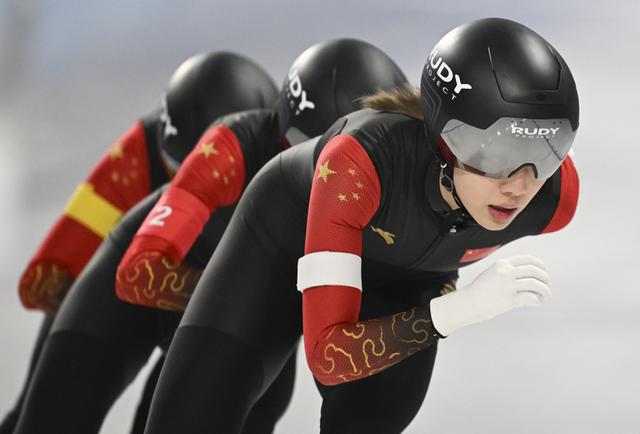 新华社照片,哈尔滨,2025年2月11日 2月11日,中国队选手杨滨瑜、阿合娜尔·阿达克、韩梅(从右到左)在比赛中。 当日,第九届亚冬会速度滑冰女子团体追逐决赛在哈尔滨举行。中国队夺得冠军。 新华社记者 陈振海 摄