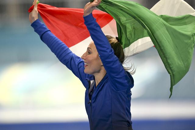 新华社照片,米兰(意大利),2026年2月7日 2月7日,冠军意大利选手洛洛布里吉达在比赛后庆祝。 当地时间2月7日,米兰-科尔蒂纳冬奥会速度滑冰女子3000米决赛在意大利米兰举行。 新华社记者 武巍 摄