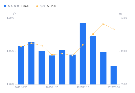 2月6日消息,数据显示,截至2026年1月30日,A股股东总户数为1.32万户,较上期(2026年1月20日)减少222户,降幅1.66%。公司最新A股总股本为9262.23万股,其中流通A股6272.32万股,户均持有流通A股数量为4758.97股,较上期增加78.83股,增幅1.68%;户均持流通A股市值27.51万元,较上期增加2731.96元,增幅1.00%。