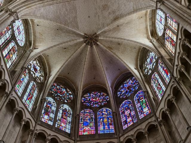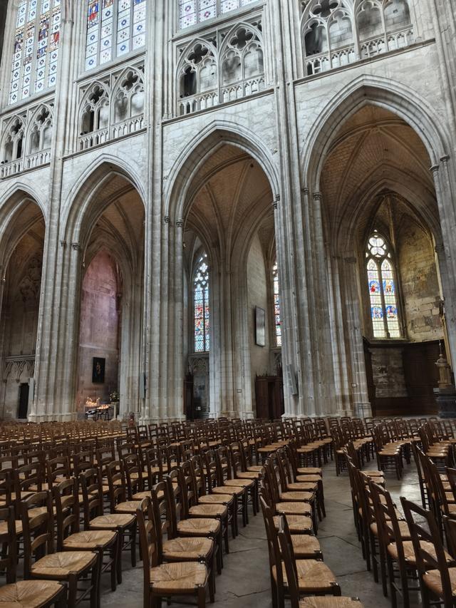 步入圣艾蒂安大教堂,古朴穹顶带来幽远的视觉延伸,对称结构带来庄严之美。16世纪完工的横厅,北翼的玫瑰花窗于1528年完成,南翼的玫瑰花窗则由纪尧姆·科尔努瓦耶设计,于1550年安装。对称的玫瑰花瓣精致华美,玫瑰花下方的宗教故事绘画栩栩如生。