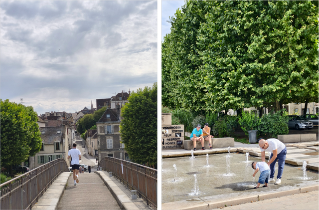 欧塞尔桥上跑过的人(左);欧塞尔河岸边喷水池边的有趣父子(右)