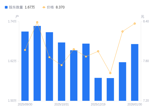 2月9日消息,数据显示,截至2026年1月30日,A股股东总户数为1.67万户,较上期(2026年1月20日)增加550户,增幅3.40%。公司最新A股总股本为6.65亿股,其中流通A股6.64亿股,户均持有流通A股数量为3.97万股,较上期减少1351.21股,降幅3.29%;户均持流通A股市值33.25万元,较上期减少6380.71元,降幅1.88%。