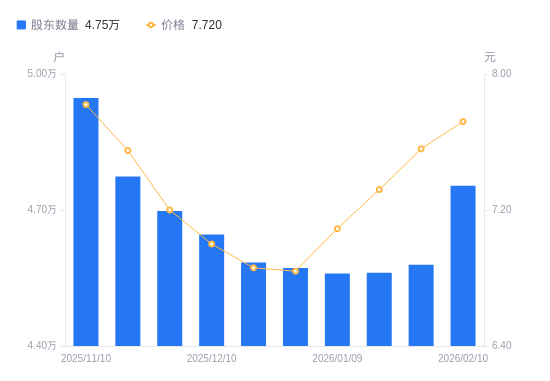 2月11日消息,数据显示,截至2026年2月10日,A股股东总户数为4.75万户,较上期(2026年1月30日)增加1744户,增幅3.81%。公司最新A股总股本为5.29亿股,其中流通A股5.29亿股,户均持有流通A股数量为1.11万股,较上期减少423.51股,降幅3.67%;户均持流通A股市值8.58万元,较上期减少1422.57元,降幅1.63%。