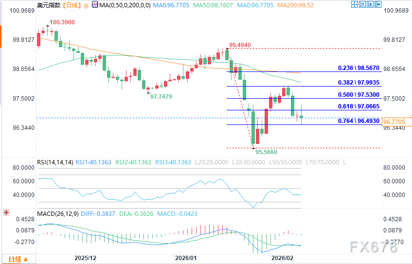 (美元指数日图 来源:易汇通)从日线摆动图表及均线系统来看,美元指数主趋势仍为下行。若突破97.973,主趋势将转为上行;若跌破今日低点96.494,将重新确认下行趋势,下一看跌目标为前期低点95.551。短期波动区间为95.551—97.973。今日早盘,指数在回调区间96.762—96.476内部的96.494位置获得支撑。随后的反弹,或为指数提供足够上行动能,挑战中期回调区间97.522—97.987。若突破该中期区间,美元指数有望测试50日均线98.205与200日均线98.540。