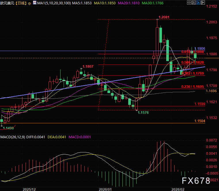 短期来看,欧元兑美元可能会丧失争夺1.19关口的机会,上方1.19心理关口构成重要阻力,下方1.828的50%斐波那契分位则是多头关键防守区域。后续需重点关注美联储官员讲话及欧洲央行委员施纳贝尔与奇波洛内的表态,叠加本周五美国通胀数据,这些因素将共同决定欧元兑美元的下一步方向选择。