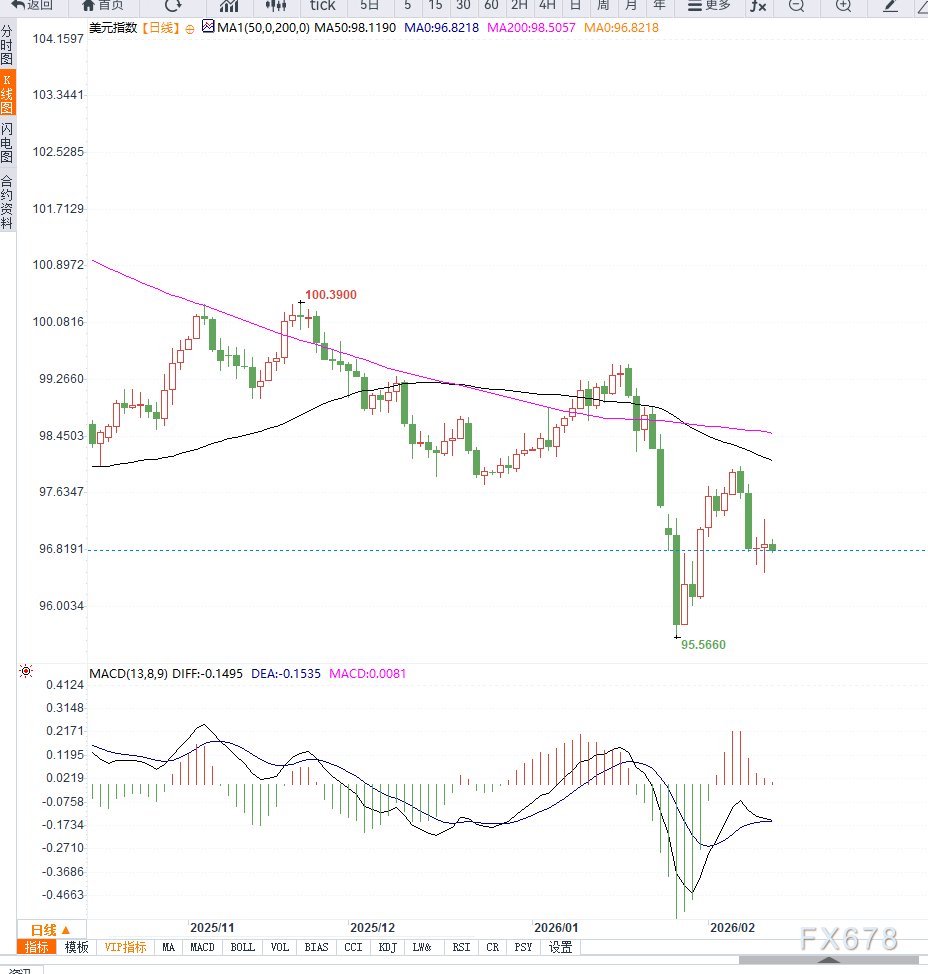 美元指数(DXY)当前处于短线震荡区间,整体偏稳但承压明显。强劲的1月非农就业数据显示美国劳动力市场韧性,支撑美元下行幅度受限,但同时美元上行动能也受到阻力,多空力量交织。