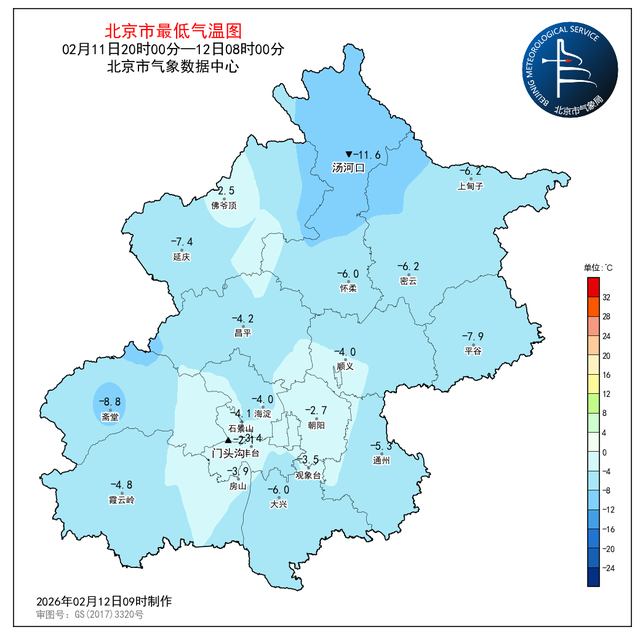 2月11日20时至12日08时,观象台最低气温-3.5℃(04:50)。