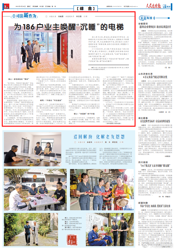 微信群里有人上传了一段视频:82岁的张奶奶在家人的搀扶下,第一次走进明亮的电梯轿厢。老人小心翼翼地抚摸着光滑的轿厢壁,嘴里念叨着:“真好……真好啊……”那份简单的满足感,透过屏幕感染了每一个人。当晚,关乎186户居民出行的7部电梯一次性通过技术验收,比法院裁定书要求的最后期限提前了两天。