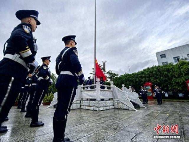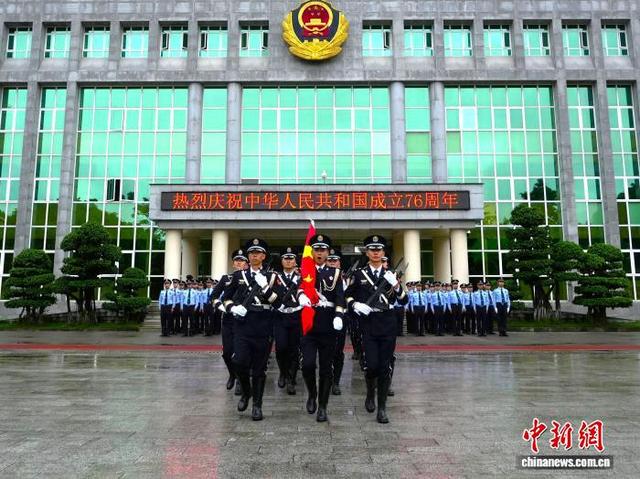 10月1日,戍守在中缅边境云南省德宏州瑞丽市的瑞丽出入境边防检查站举行国庆升旗仪式。9时整,参加仪式的全体民警警容严整,整齐列队在升旗台前,护旗队伍迈着整齐划一的步伐向升旗台行进。升旗仪式开始,五星红旗伴随《义勇军进行曲》冉冉升起。全体人员庄严肃立,满怀崇敬向国旗敬礼,高唱国歌,共同庆祝中华人民共和国成立76周年。图为国旗升起。高运畅治 摄