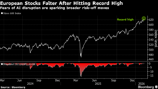 欧洲股市逆转走势,跟随美国股市下挫,因市场普遍担忧人工智能引发的行业冲击。