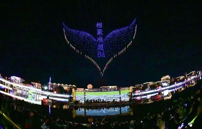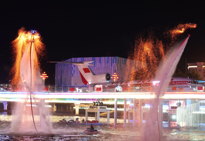 夜幕降临后,活动精彩度持续升级。《焰耀准旗》表演率先点燃夜空:群炉打铁花在黑暗中炸开,铁花如星河落向水面,水上飞人踩着喷射器穿梭其间,飞天威亚演员 “踏浪而行”,视觉冲击拉满。紧接着,大河音乐会接棒登场,ZaZaZsu 的《爱河》、张彤禧 Selina 的新歌《Daydreamin》、kawa 的《干酒醉》轮番上演,而当叶世荣带着乐队奏响《海阔天空》《光辉岁月》时,全场游客自发举起手机闪光灯摇晃,熟悉的旋律引发集体大合唱。“听到《海阔天空》瞬间泪目,这是刻在青春里的歌!” 从河北来准旗旅游的王磊说,原本只是计划看黄河风景,没想到偶然赶上这场音乐会,“传统表演够味,经典金曲够燃,这趟国庆行太值了。”