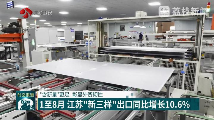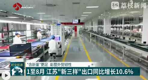 统计显示,1到8月份,江苏电动汽车、锂电池、光伏产品“新三样”产品出口1214.5亿元,同比增长10.6%。代表绿色低碳,且“含新量”更足的外贸结构,彰显了江苏的外贸韧性,正为江苏经济高质量发展注入强劲动能。
