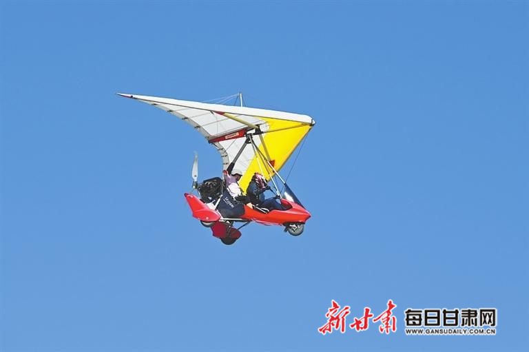 游客在敦煌市鸣沙山月牙泉景区乘坐动力滑翔机。新甘肃·甘肃日报通讯员 张晓亮