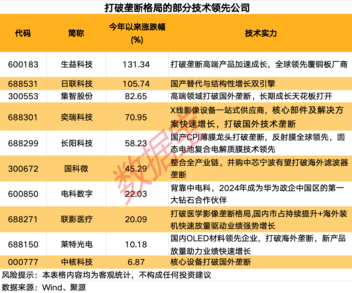 根据券商研报的研究内容,上述130家公司中,有多家公司的核心技术有望打破垄断或聚焦关键产业,据数据宝不完全梳理,这一类公司共有等10家。