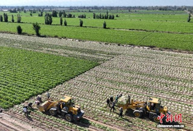10月3日,工作人员在宁夏银川市金凤区良田镇“汉白玉”萝卜种植基地采收萝卜。近日,宁夏银川市金凤区良田镇的特色“汉白玉”萝卜喜获丰收,迎来产销两旺。目前,日均高达200吨的萝卜正源源不断地发往上海、成都、南昌等全国多地。近年来,金凤区设施农业的蓬勃发展,不仅为当地产业注入了强劲活力,更拓宽了村民的就业渠道,实实在在地鼓起了村民的“钱袋子”。(无人机照片)中新社记者 于晶 摄