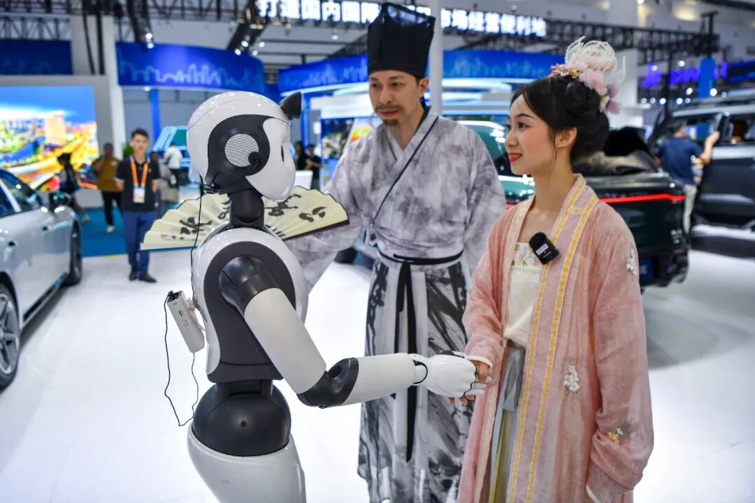 2024年4月15日,海南海口,第四届中国国际消费品博览会上,身着汉服的参观者与“柔美人形智能服务”互动。中新社记者 骆云飞 摄