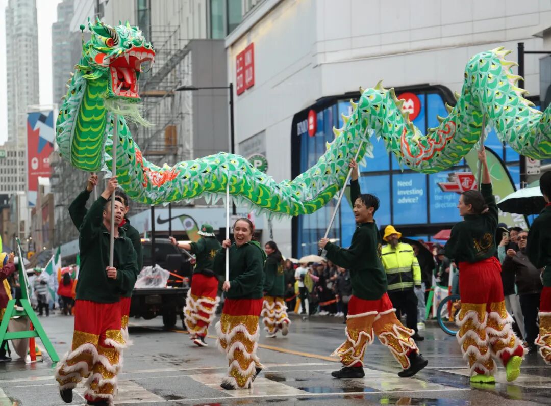 当地时间2025年3月16日,加拿大多伦多,在庆祝爱尔兰民族传统节日圣帕特里克节(St. Patrick’s Day)的大游行中,一支中式舞龙队舞动绿色长龙。中新社记者 余瑞冬 摄