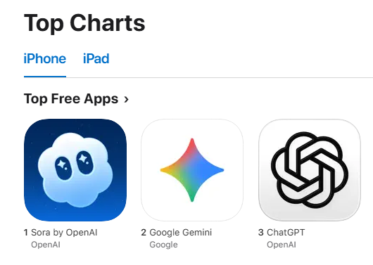 值得一提的是,该榜单的前三名分别为Sora、谷歌Gemini和ChatGPT——OpenAI的产品占了两席。与此同时,Sora也是苹果美国App Store中“摄影与录像”类别的第一名。
