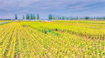 金秋时节,市杭锦旗吉日嘎朗图镇14万亩葵花正式进入收割期,集中连片满眼金黄的葵花与辛勤收割的农民共同构成了节日期间一道丰收的亮丽风景。本报记者 王磊 摄