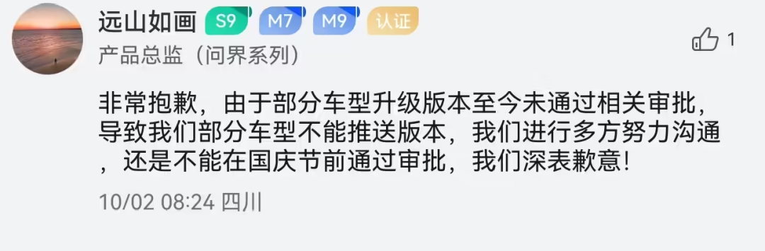电动知家消息,10月2日,问界系列产品总监在鸿蒙智行App上正式发文致歉,确认由于未能获得相关审批,部分问界车型的ADS 4智能驾驶系统升级版本无法按原计划在国庆节前向车主推送。尽管公司进行了多方努力和沟通,但审批流程仍未能在假期前完成,导致部分车主无法收到更新。从车主社区的反馈来看,受影响的主要是问界M7车型。