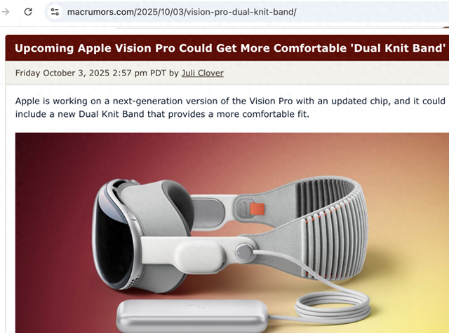 【环球网科技综合报道】10月4日消息,据外媒macrumors报道称,苹果服务器出现“Dual Knit Band(双层针织表带)”字段,对应产品编号与现有Vision Pro配件体系并列,却尚未在官网或零售渠道上线。结合彭博社此前报道,这一全新头带将在2025年底随升级版Vision Pro一同发布,目标直指用户长期佩戴的“重量痛点”。