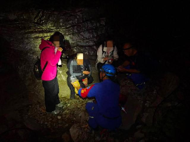 上山途中岔路很多,经验丰富的队员们需不断修正方向。22时许,队员们找到3名被困者,当时3人处在一处3米高的断崖下,询问得知,他们身体状况无大碍,只是有一名被困者左膝盖有点受伤,队员们赶紧把带来的食物和水发给他们,同时想办法把三人安全转移到断崖上方。