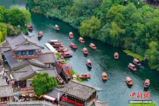 10月4日,古城湖北襄阳各类仿古建筑、国潮街区成为市民游客热门打卡点。作为国家历史文化名城,襄阳历史文化底蕴深厚。图为襄阳唐城影视基地,游客乘舟览景。(无人机照片)张倩龙 摄