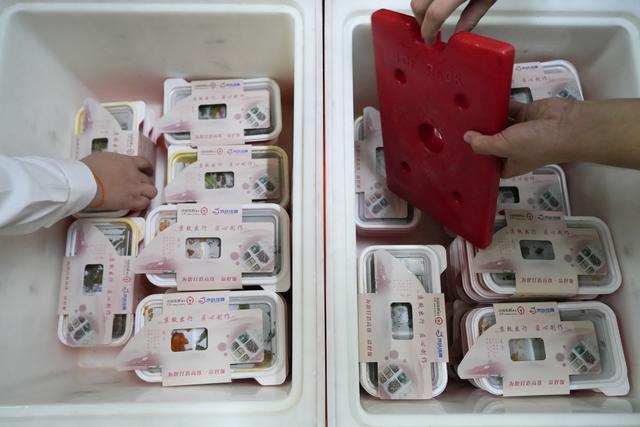 冒着热乎气的饭菜出锅后,工作人员立刻开始分装,菜品按照重量装进橘黄色的环保餐盒内,再装进标有高铁车次的专用保温箱内。特制的保温箱内里垫上了加热板,可以起到良好的保温效果。