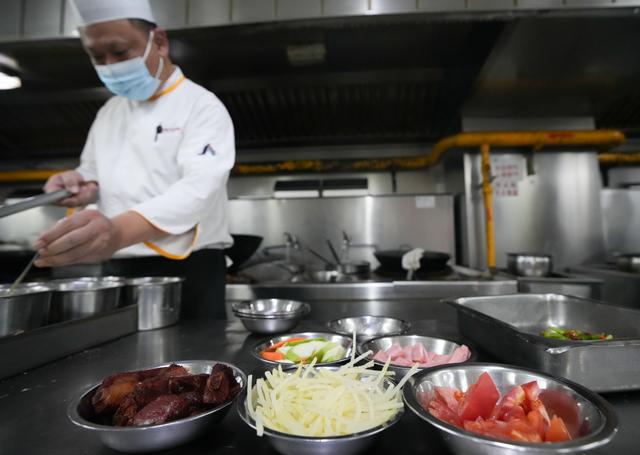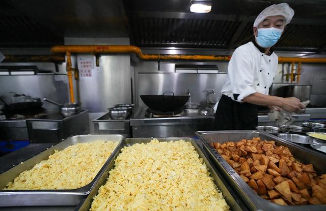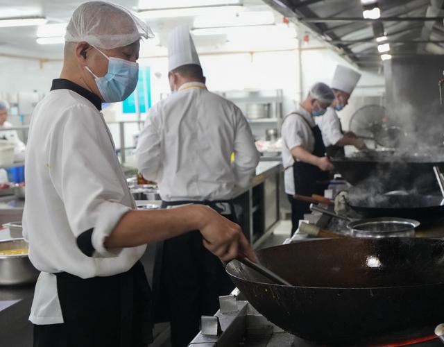 中秋国庆假期,随着订单量增多,厨房里的工作人员更忙了,冯伟和同事们要比平时更早到,手上的动作得更快一些。烹炒区的燃气灶前,四五名大厨熟稔地颠勺、用料、用勺翻炒。一根葱、一瓣蒜、一勺盐、一滴油,都要在有限的时间内用料精准,分毫都不能差。“菜品炒制一般要在高铁开车前一小时左右完成,我们需要看着时间表做菜,不能太早也不能太晚。”冯伟说道。