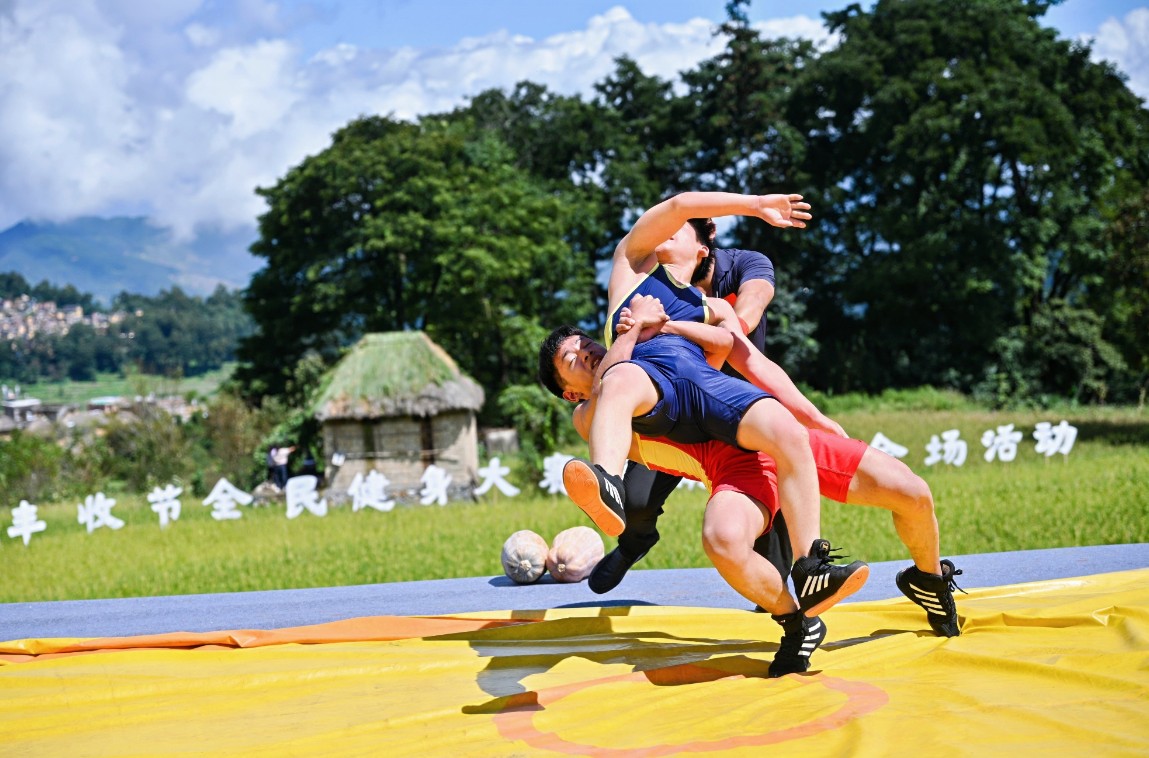 “哈尼梯田泥泞挑战赛”在欢快的哨声中激情开赛,300余名来自全国各地的参赛选手脚踏松软泥土,在设有重重关卡的梯田赛道上展开激烈角逐。“泥地寻宝”环节趣味十足,选手们俯身于金秋梯田,仔细探寻藏匿其中的南瓜、鸭蛋等模型,成功找到即可兑换相应实物,在欢乐比拼中深度体验农耕收获的乐趣;“稻田捕鱼”环节更是妙趣横生,选手们卷起裤腿,在梯田水域中徒手捕鱼,水花四溅间,欢声笑语回荡在田野之上。下午,“哈尼梯田民族跤王赛”同样精彩绝伦,选手们身手矫健,抱腰、缠腿、过肩摔等传统技法信手拈来,生动再现了历史上以“摔跤裁定”解决水田纠纷的文化场景。赛事设置成年组、青年组及儿童组,按体重和年龄分级对抗,既有力量与技巧的激烈碰撞,更有友谊与文化的深度交流。