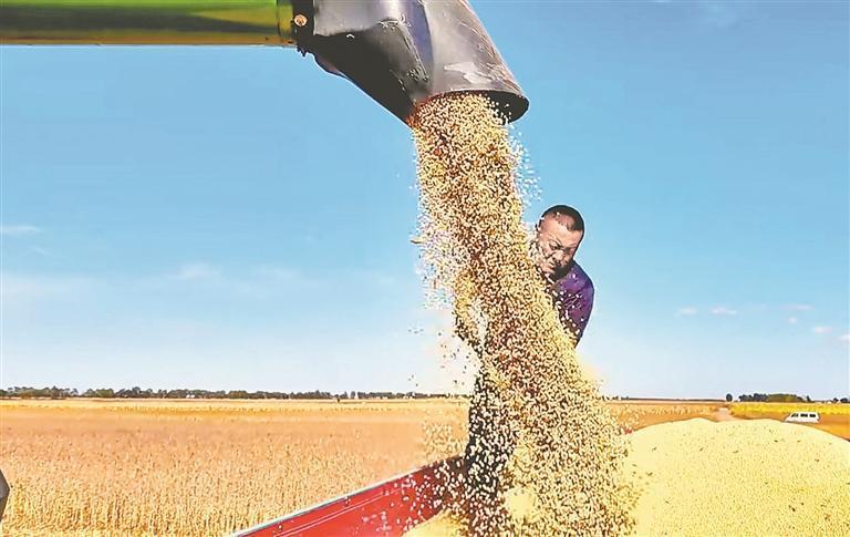 国庆假日,丰收时节。秋风拂过宝清县青原镇的田野,连片的大豆田泛起金黄浪涌,饱满的豆荚压弯豆秆,收割机轰鸣作业,农户们忙着分拣、装袋,丰收的喜悦在田间地头蔓延。