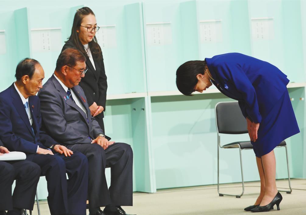 10月4日,在日本东京的自民党总部,高市早苗(右一)在自民党总裁选举中胜出后鞠躬致意。 新华社发