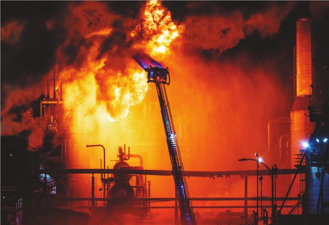 当地时间10月2日晚,在美国加利福尼亚州埃尔塞贡多市,美国雪佛龙石油公司旗下一座炼油厂突然爆炸起火。目前暂无人员伤亡消息。图为消防部门进行灭火作业。