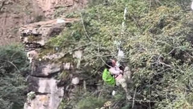 惊险一幕!女子跌落悬崖死死抓住藤蔓,被众人用保温毯拧绳救起