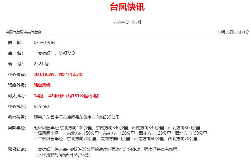 据中央气象台消息,今年第21号台风“麦德姆”10月5日05时由台风级加强为强台风级,其中心在距离海南省文昌市偏东方向约140公里的南海海面上,就是北纬19.8度、东经112.3度,中心附近最大风力14级(42米/秒约151公里/小时),中心最低气压为955百帕,七级风圈半径340-400公里,十级风圈半径120-150公里,十二级风圈半径60-70公里。
